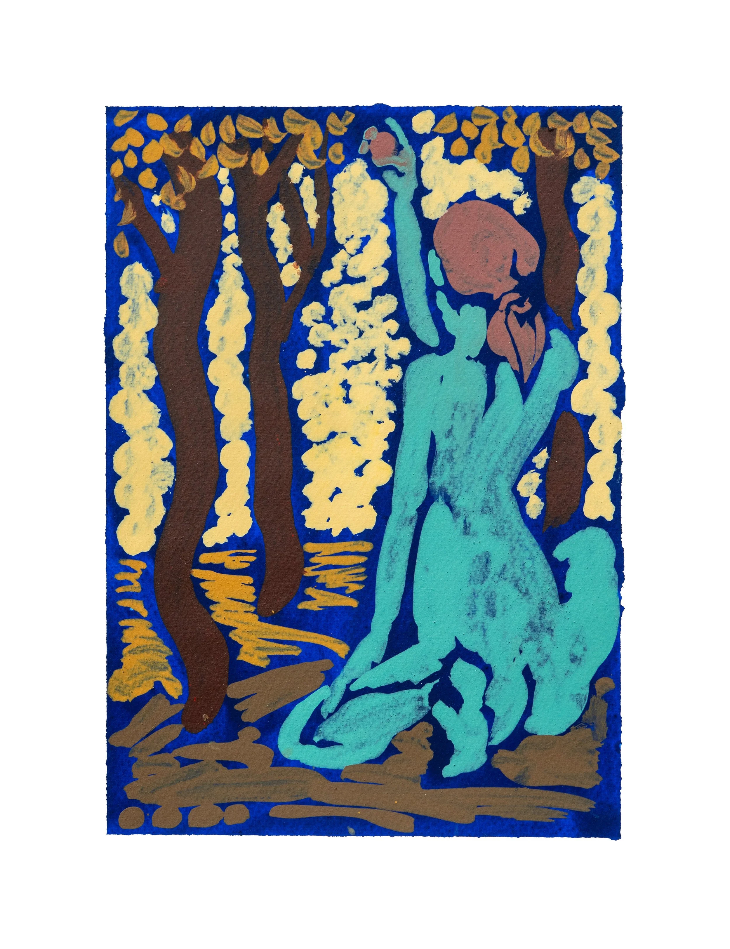 In the painting “An Education,” Redwood presents an allegory of art, and the artist’s personal understanding of contemporary painting. On the left side is a realistically painted figure that stands for representation in painting. From left to right, in the form of four sequentially devolving figures, it breaks down realism into geometric abstraction— the fourth figure, a narrowing plank-like form, is entirely abstract. The scene calls to mind the tradition of storytelling around a fire, and parallels Redwood’s desire to reengage traditions of painting while inventing original work. Each painting’s narrative unfolds through fluent brushwork of either art historical or personal inventory, challenging viewers to enjoy these subtleties.